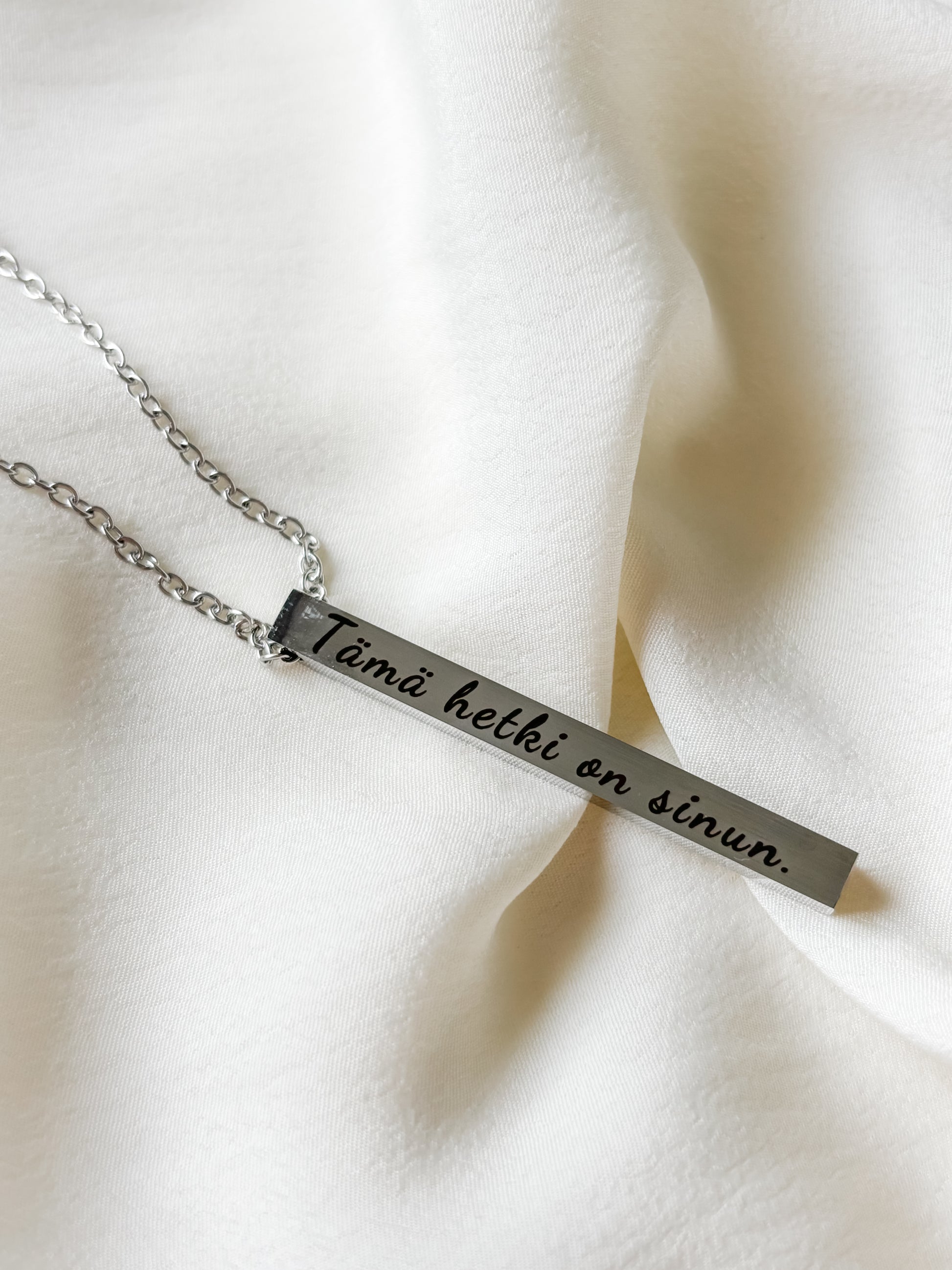 Ajaton ja tyylikäs kaulakoru muistuttaa sinua elämään tässä ja nyt. Kaiverrus “Tämä hetki on sinun” kantaa mukanaan voimaa, rauhaa ja merkitystä jokaiselle päivälle.